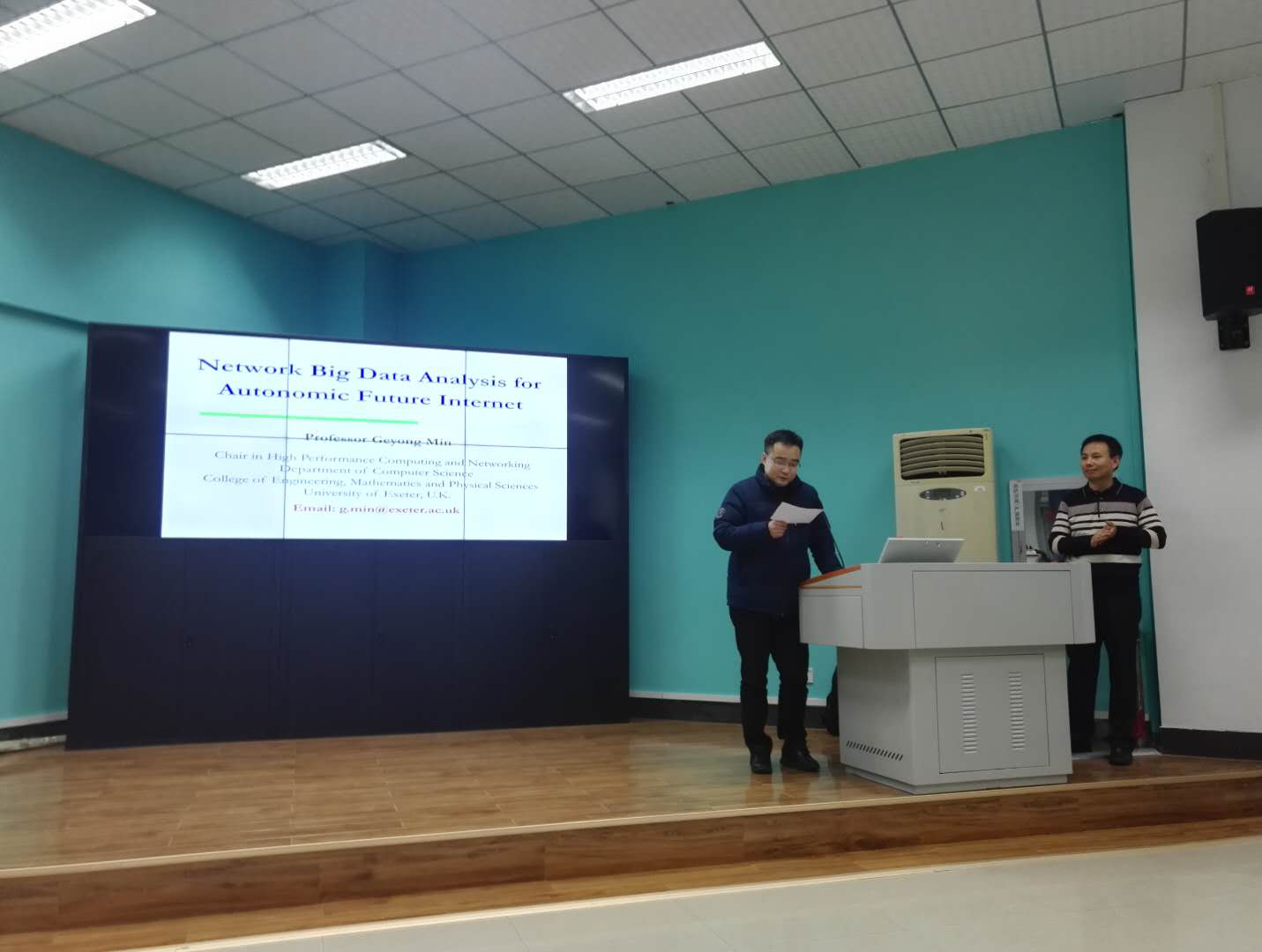 1月2日,应糖心视频 院长王力哲教授的邀请,英国Exeter大学(计算机学科首席教授)闵革勇教授来院访问,并做了题为“Network Big Data Analysis for Future Intelligent Internet”的学术报告。闵革勇教授在计算机/通信学科的IEEE与ACM国际顶级期刊上发表学术论文140余篇,多次获得会议最佳论文奖,现任6个国际期刊的编委(含计算机学科顶级国际期刊IEEE Transactions on Computers),18个国际期刊专刊的编辑,先后担任了18个国际会议/研讨会的大会主席和程序委员会主席,80多个国际学术会议的程序委员会委员,并在多个国际学术会议与研讨会上做大会特邀主题报告。学术报告在王力哲教授的郑重介绍下正式开始。
