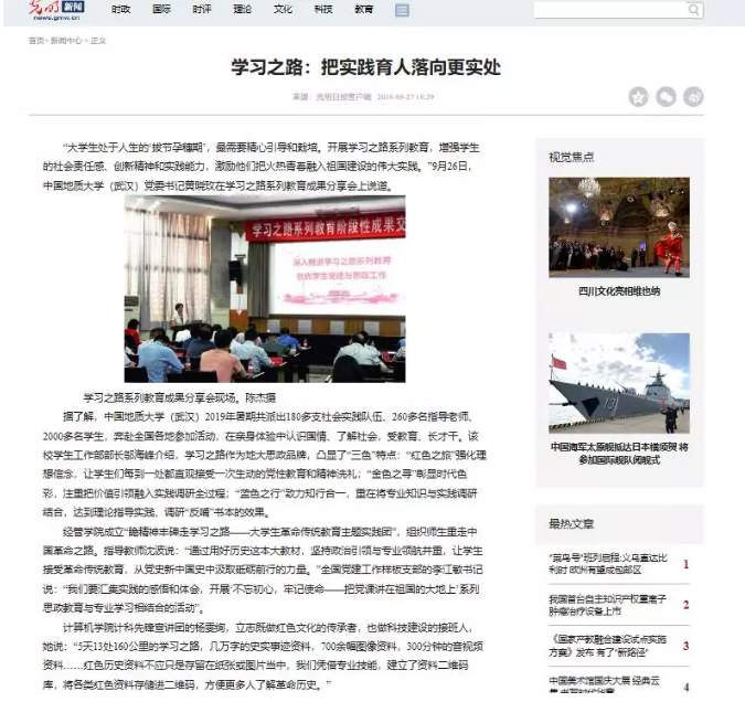 “计科先锋宣讲团”实践过程先后被国家级媒体报道3次(光明日报网、先驱日报网、现代青年网),县级媒体报道2次(红安热线、红安县校办),校级媒体报道8次(地大新闻网、CUG科协、大学生网报),共计13次,不含重复报道。