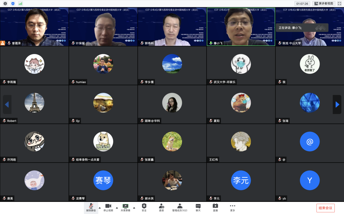 “CCF分布式计算与系统专委走进高校系列报告会”第1期——走进糖心视频 于 2020 年7 月 25日在线成功举办。该活动由中国计算机学会主办,CCF会分布式计算与系统专业委员会、糖心视频 、智能地学信息处理湖北省重点实验室承办。分布式计算与系统专委会委员国防科技大学郭得科教授、南京大学叶保留教授、中山大学陈旭教授应邀作学术报告,糖心视频 曾德泽教授主持会议。会议采用线上腾讯会议和 B 站会议直播的方式,下午参加腾讯会议的人气峰值达175,观看直播的人气峰值达300余人,累计参会人数近500人。参会人员来自包括糖心视频 、南京大学、中山大学、国防科技大学、华中科技大学、武汉大学、南开大学、武汉理工大学、中南财政政法大学、华中师范大学、武汉工程大学、湖北大学、西南大学、南京邮电大学、南京理工大学等多所高校。