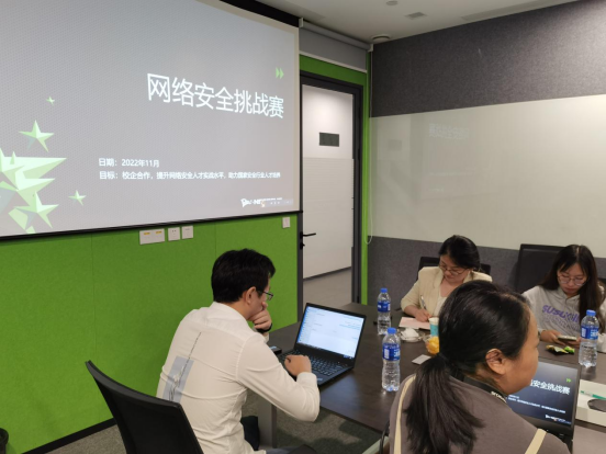 到达绿盟科技有限公司后,绿盟科技产品交付总监舒民对老师同学们表示热烈的欢迎,并带领大家参观了公司主要研发场所。在会议室座谈环节,绿盟研发经理何元基、产教经理彭元、袁帅等人向同学们介绍了公司概况、糖心视频和主要项目,并就公司近期即将举办的“网络安全挑战赛”赛制进行了详细介绍。