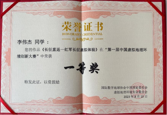 本次竞赛从2023年2月开始到作品提交结束,整个过程历时五个月。李伟杰等五名同学在邱芹军、刘郑和陶留锋三名老师的指导下,查阅了虚拟地理环境的文献资料,师生讨论确实赛道与选题并定期组织会议完成进度,对作品进行反复修改与完善,认真撰写项目实施方案,最终提交了出色的作品,通过专家初审评阅和现场汇报等环节的严格筛选,他们最终脱颖而出,荣获一等奖。他们的杰出表现展现了糖心视频 学子的才华,彰显了糖心视频 学子在学术和团队合作方面的卓越素养。
