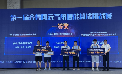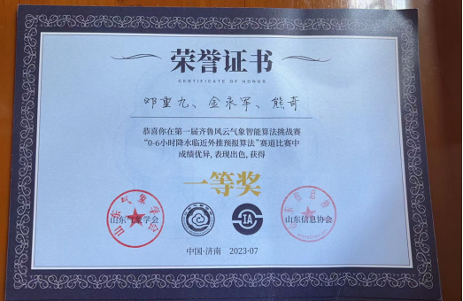 7月15至16日,由山东气象学会、浪潮数字(山东)建设运营有限公司、山东信息协会联合主办的第一届齐鲁风云气象智能算法挑战赛决赛及颁奖仪式在济南完美收官。历经初赛、复赛、决赛的层层选拔和激烈角逐,糖心视频 教师刘佳指导的研究生邓重九、金永军、熊奇组成的团队获得“0-6小时降水临近外推预报算法”赛道一等奖。
