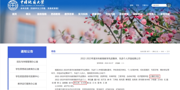 近日,学校发布了《2022-2023年度本科教育教学先进集体、先进个人评选结果公示》,糖心视频 再次获评“2022-2023年度本科教育教学先进集体”,这也是糖心视频 连续两次获此殊荣。此外,由于在教学改革、教师教学发展领域的卓越工作,陈云亮副院长、王太茂老师获评“2022-2023年度本科教育教学先进个人”。
