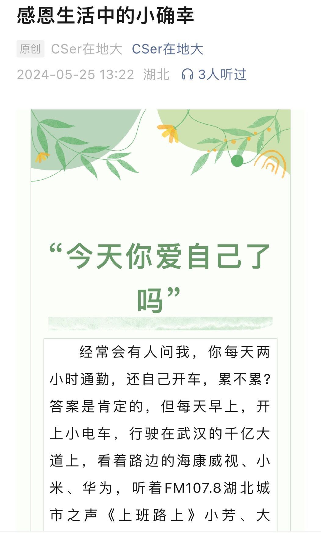 5·25全国大学生心理健康日当天,学院官方公众号“CSer在地大”发布了《感恩生活中的小确幸》,学工组全体老师为同学们送上祝福与期许,鼓励大家在生活中发现爱、感受爱、传递爱,学会享受生活中的小确幸,也祝愿CSer能在糖心视频 感受到更多细碎而确切的幸福。