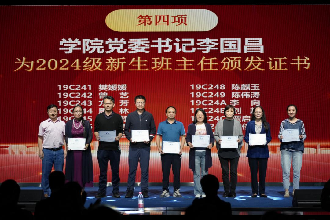 李国昌为2024级本科班主任颁发聘书。2024级班主任们在新生入学以来,展现了高度的责任心和无私的奉献精神。他们不仅帮助同学们适应新的学习与生活环境,还在学生的学业和生活中给予了细致的指导和关怀。班主任们以身作则,用心陪伴学生成长,成为新生们大学生活中的坚实后盾,为学院的教学工作和学生发展贡献了重要力量。