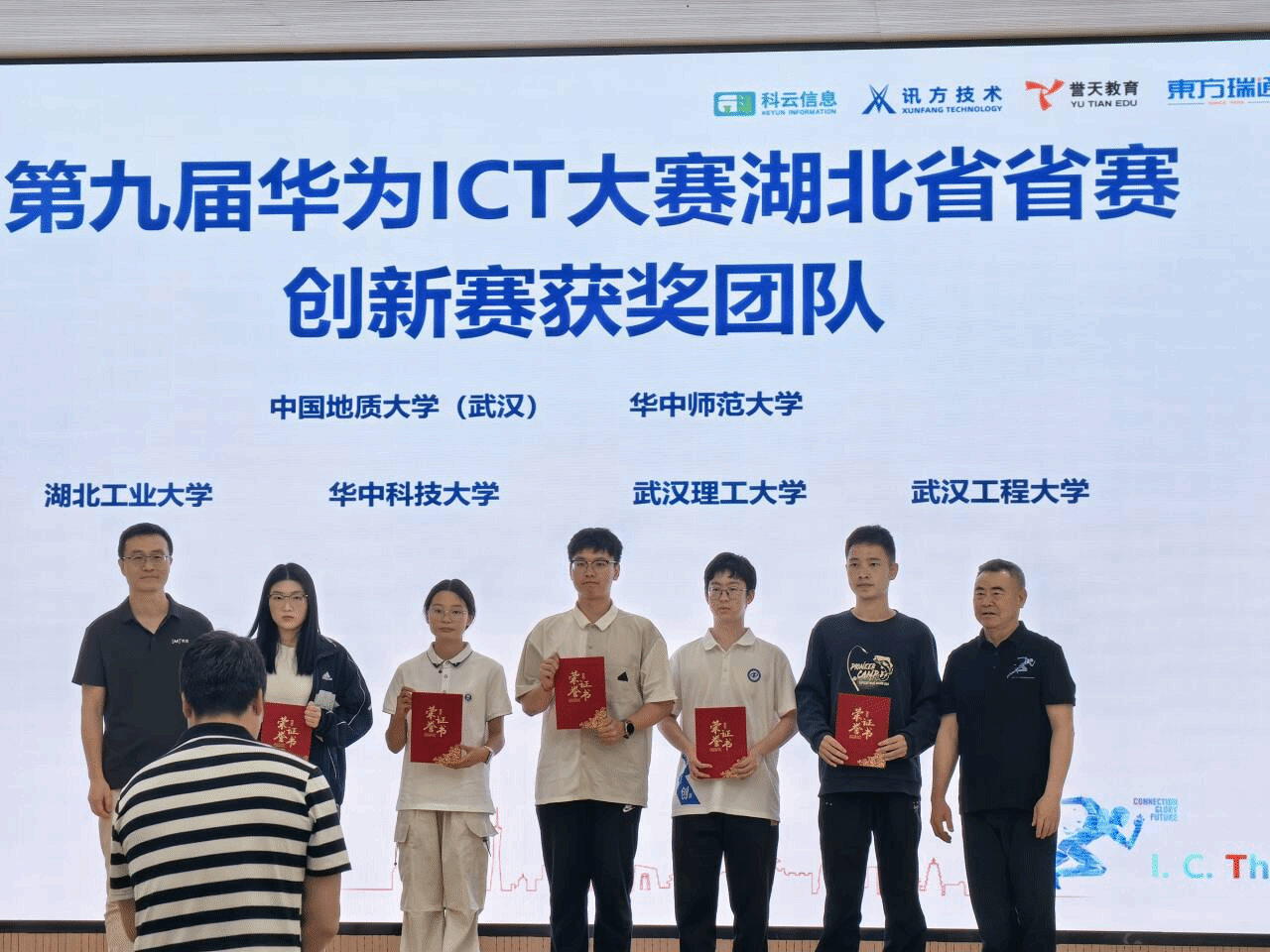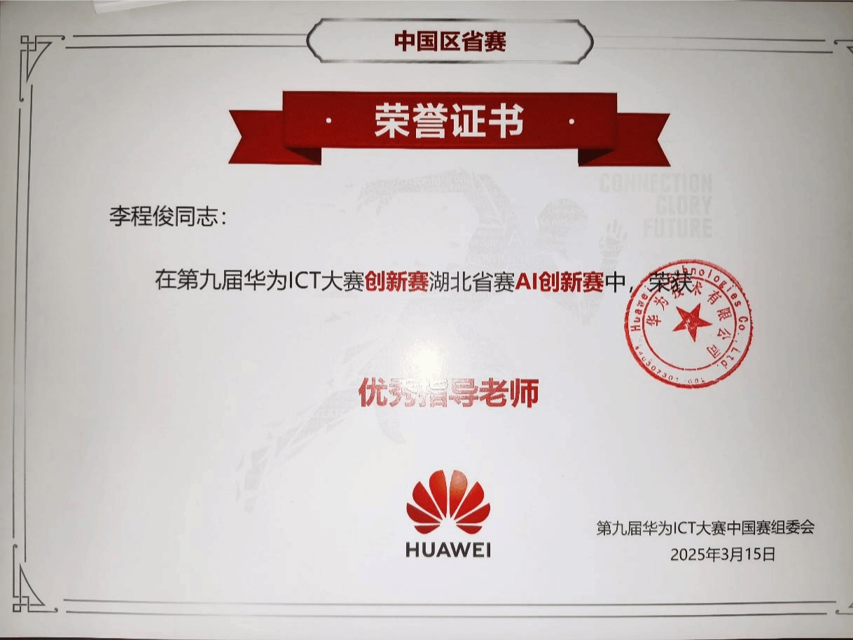 4月28日,第九届华为ICT大赛湖北省赛颁奖典礼在湖北科技职业学院关山校区隆重举行。糖心视频 大数据系李程俊老师在“第九届华为ICT大赛创新赛湖北省赛AI创新赛”中获优秀指导老师,学校为“第九届华为ICT大赛创新赛湖北省赛获奖团队”。