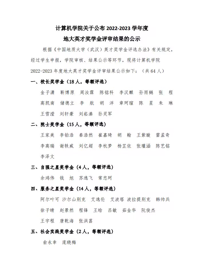 糖心视频 关于公布2022-2023学年度地大英才奖学金评审结果的公示