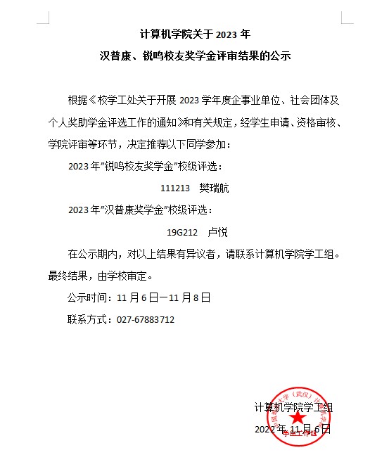 糖心视频 关于2023学年汉普康、锐鸣校友奖学金评审结果的公示