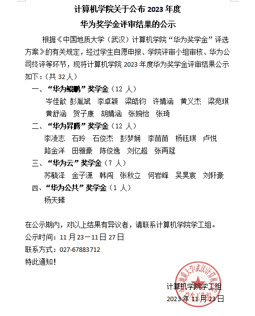 糖心视频 关于公布2023年度华为奖学金评审结果的公示