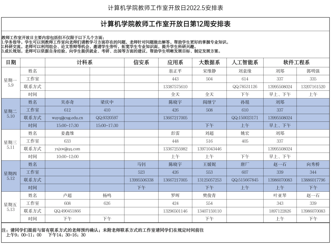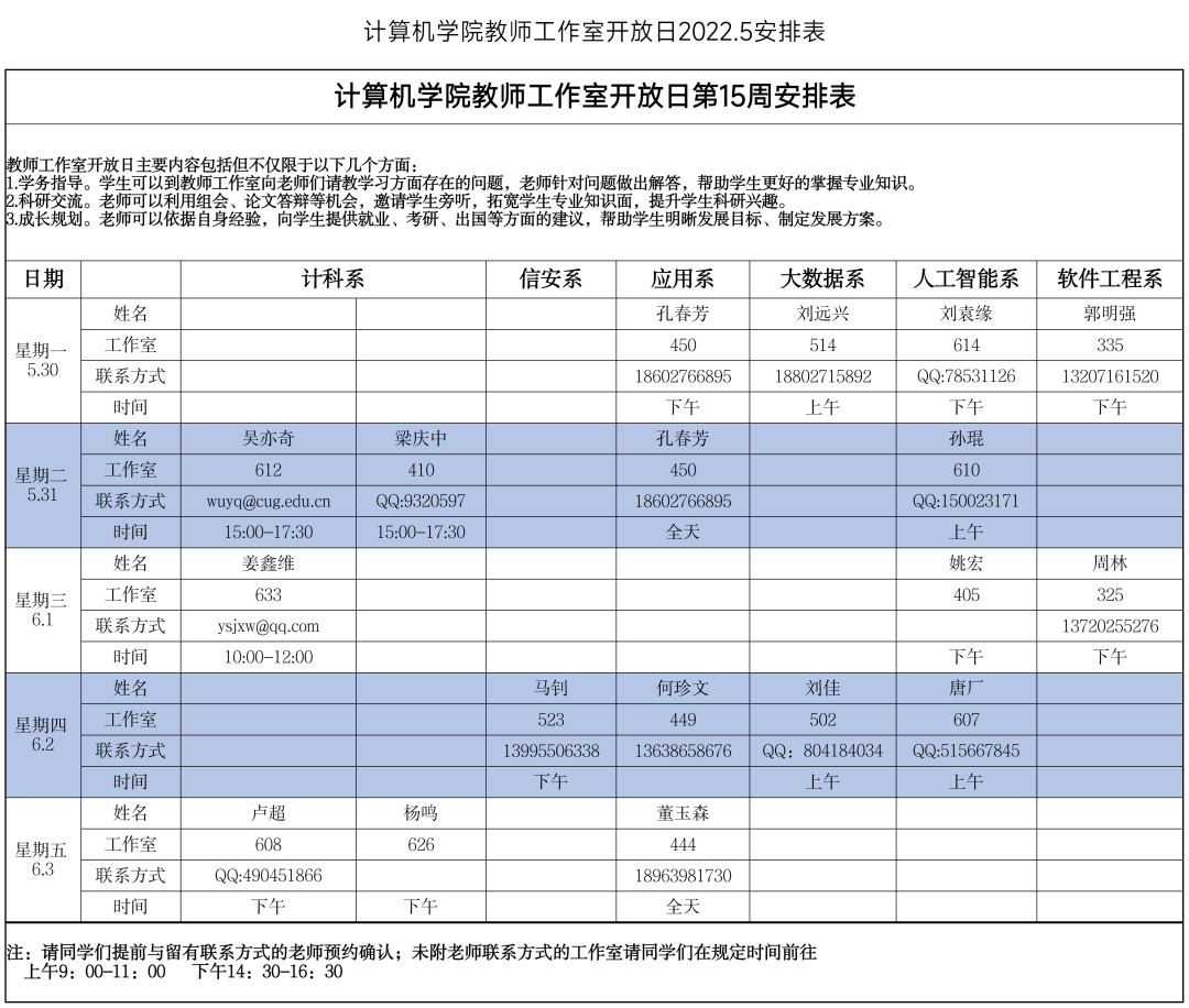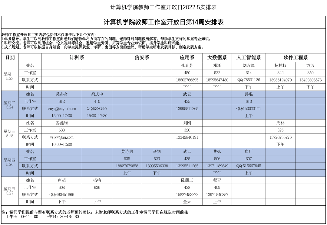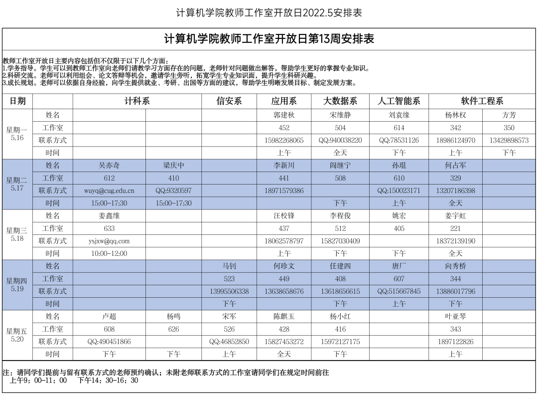 请大家仔细阅读老师们的时间安排,也可以提前进行预约,希望同学们能够好好珍惜同老师们近距离交流的机会,多跟老师们沟通,提升自己!