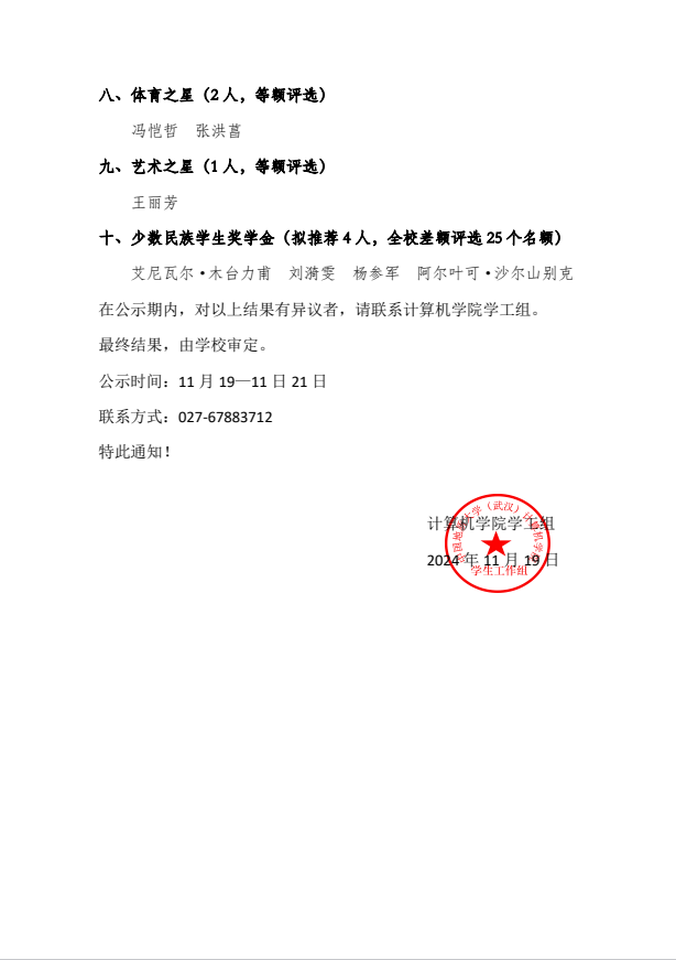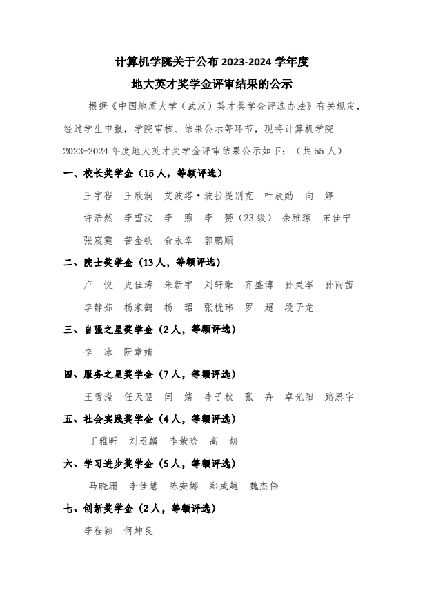 糖心视频 关于公布2023-2024学年度地大英才奖学金评审结果的公示