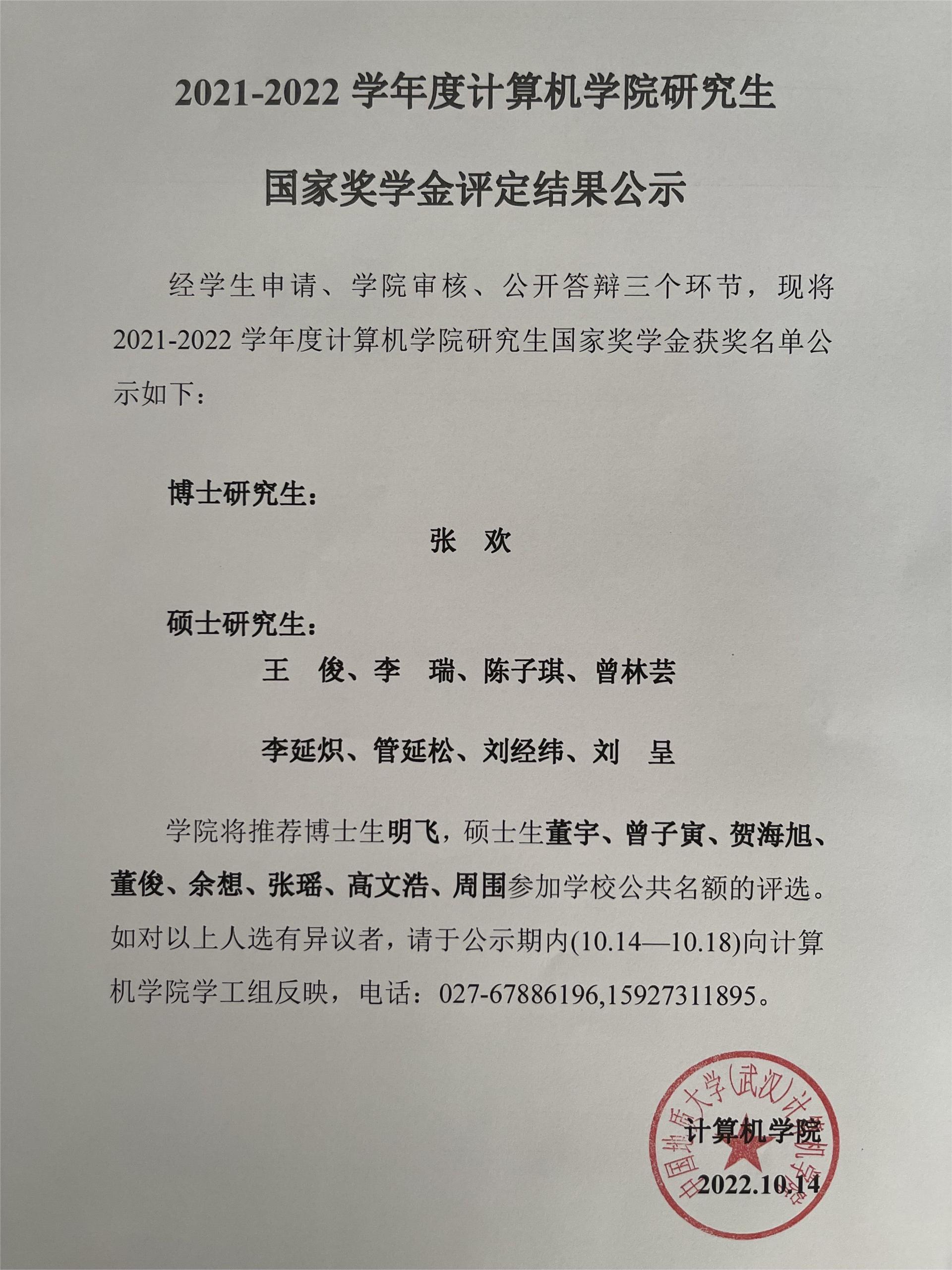 2021-2022学年度糖心视频 研究生国家奖学金评定结果公示