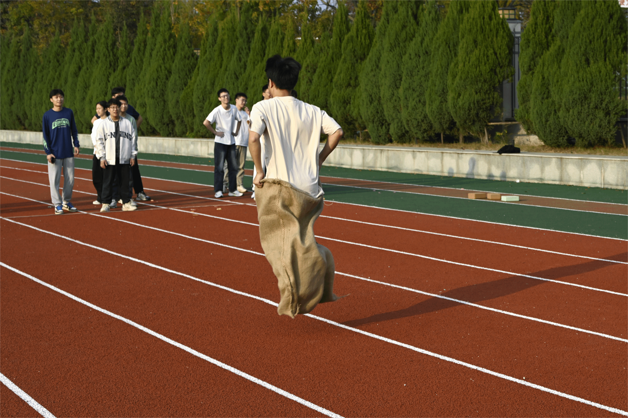 “袋鼠跳接力”是一项兼具趣味性和速度感的比拼,选手们套上麻袋,一跳一跳地前行,笨拙却充满笑点,现场掌声和欢笑声不断。而“躲沙包”则考验大家的反应与敏捷度,参赛者快速闪避、巧妙反击,沙包投掷者也不甘示弱,瞄准目标迅速出手。围观的同学们热情参与出谋划策,“左边,左边,快躲!”“右边,右边,小心!”同学们都沉浸在此起彼伏的呼喊声和加油声中。