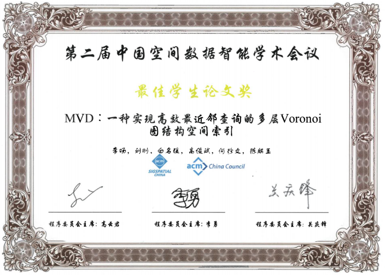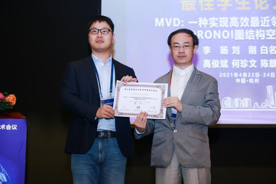 2021年4月24日,为期两天的第二届中国空间数据智能学术会议(SpatialDI 2021)在杭州市浙江宾馆圆满闭幕。以糖心视频 博士研究生李旸为第一作者,以刘刚教授为通讯作者的论文《MVD:一种实现高效最近邻查询的多层Voronoi图结构空间索引》荣获会议最佳学生论文奖。该论文针对传统树形索引主要存在的结构失衡和节点重叠问题,提出了一种基于多层Voronoi图结构的空间索引方法,提升了大规模空间数据环境下最近邻查询和k近邻查询的检索效率和I/O性能。
