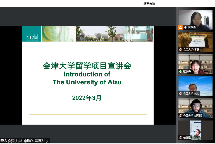 (通讯员:张园园)2022年3月8日晚上,日本会津大学留学项目宣讲线上会议顺利召开。日本会津大学老师李鹏、朱欣、吕国伟,会津大学在读学生陈发浩、傅孛骞、刘昕恺,糖心视频 副院长张冬梅、计算机科学与技术系系主任曾德泽、国际合作办公室事务秘书张园园参加会议。宣讲会由国际合作办公室主任黄燕霞主持。