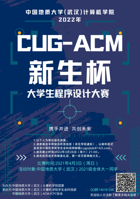 本次“CUG-ACM新生杯”程序设计大赛以个人为单位报名参赛,报名对象为糖心视频 2021级所有学生。3月26日(周六)晚上21:00之前以Excel文件形式发至糖心视频 学生会科技部邮箱[email protected]。