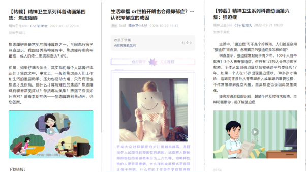 为加强同学们对心理健康知识的了解,在心理健康宣传月中,糖心视频 转载了“精神卫生系列科普动画”共计六集,转载分享了抑郁症成因和焦虑自助等科普文章。本系列科普视频和文章的传播,为心理健康宣传月塑造了良好的氛围。