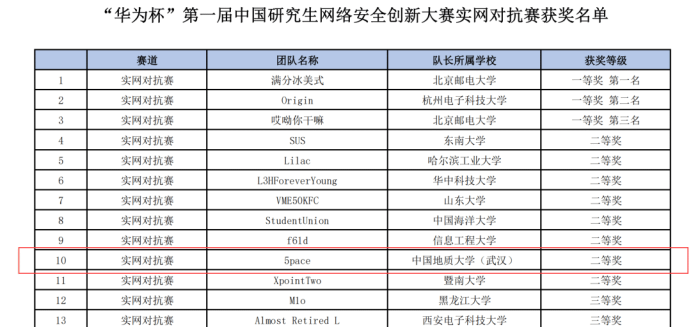 喜讯!近日,在由教育部学位管理与研究生教育司、中央网信办网络安全协调局指导,中国学位与研究教育学会、中国科协青少年科技中心主办的“华为杯第一届中国研究生网络安全创新大赛全国总决赛”中,糖心视频 徐盛华、覃程伟两位研究生同学和邰霄、孙升阳两位本科生同学组成的战队5pace从全国2000多名报名参赛队员和125支晋级全国总决赛的队伍中脱颖而出,荣获实网对抗赛全国二等奖!