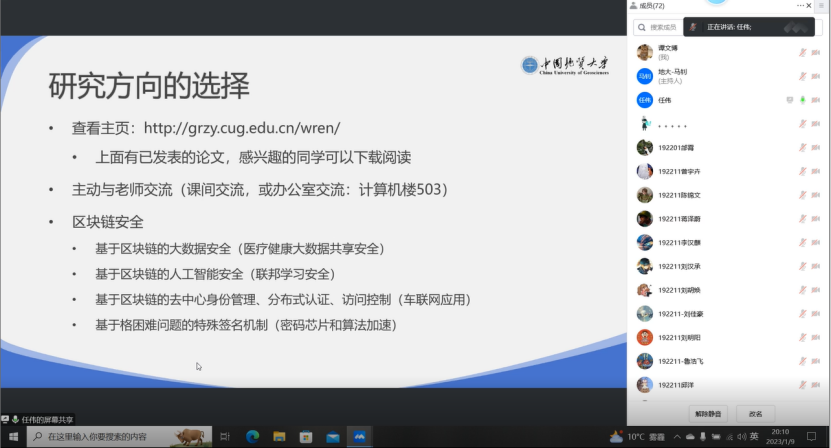 2023年1月9日晚,为了让同学们尽快熟悉信息安全专业情况,融入到信安大家庭,糖心视频 信息安全专业2021级师生新春见面会暨“1111”人才培养计划发布会通过腾讯会议在线上顺利举办。糖心视频 党委副书记傅苑、糖心视频 信息安全系全体教师、糖心视频 信息安全专业2021级全体同学和2021级辅导员谭文博参加本次会议,会议由信息安全系党支部书记马钊老师主持。