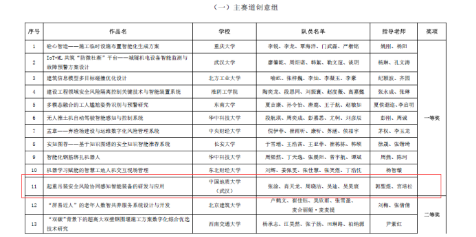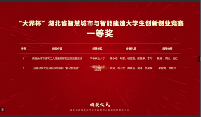 据悉全国智慧城市与智能建造大学生创新创业竞赛是当前工程管理领域影响力最大、影响范围最广的学科竞赛。本次比赛,糖心视频 2021级本科生吴昊宸与经济管理学院工程管理专业组成联队(团队成员:张淦、肖天龙、周晓洁、吴迪、吴昊宸),以参赛作品“起重吊装安全风险协同感知智能装备的研发与应用”(指导老师:郭聖煜、宫培松)进入决赛,最终从大赛主赛道来自98所高校的107支队伍的参赛作品中脱颖而出,荣获一等奖。此前在“大界杯”湖北省智慧城市与智能建造大学生创新创业竞赛中,该参赛作品已经获得一等奖。