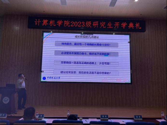 张院长首先肯定了同学们为考研付出的努力,对2023级研究生的到来表示热烈的欢迎。他以学校发展历史与人才培养成绩为切入点,向同学们展示了学校丰厚的底蕴,并从专业设置、师资队伍、科研平台与科研项目等方面介绍了学院近年来发展的概况。他谈到,国家在高新领域的巨大投入以及良好的政策指引,学校深厚的学术科研底蕴和一代代地大人的砥砺奋斗,为今天的在座的同学们奠定了良好的成长环境和优渥的发展平台,希望同学们秉承“艰苦朴素,求真务实”的校训精神,在地大糖心视频 刻苦钻研,实现出属于自己的新突破,为国家前沿科技发展贡献自己的力量!
