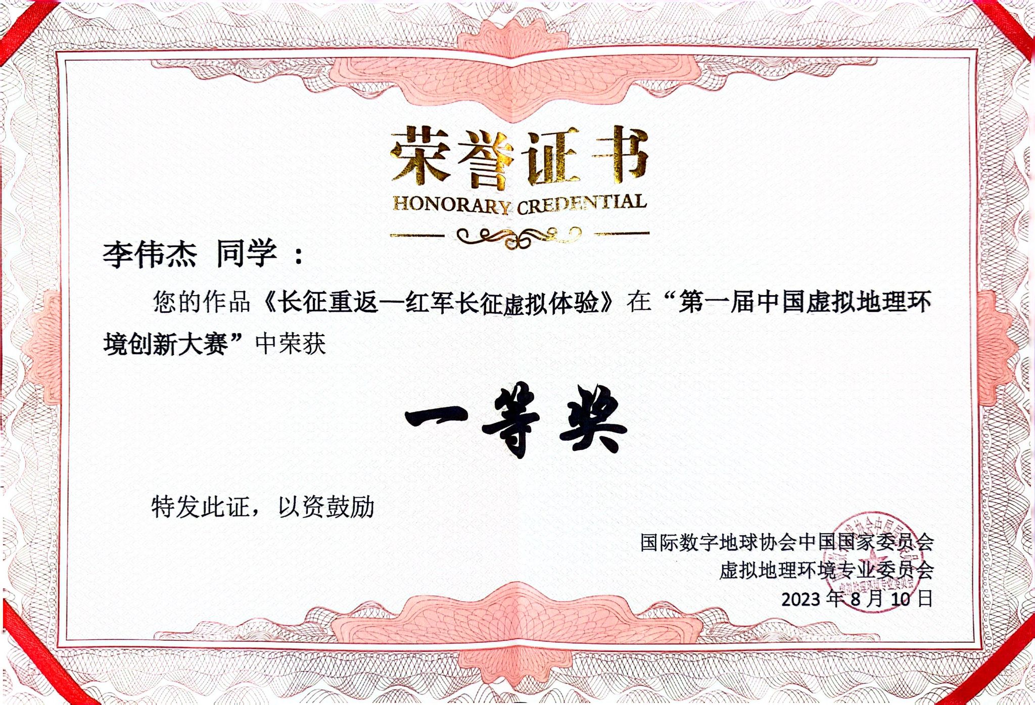 编者按:经过激烈的角逐,在吉林延边举行的2023年第一届中国虚拟地理环境创新大赛圆满落幕。糖心视频 的李伟杰、郝孟璂、王洋、刘建东、郑诗语五位研究生组成的“长征重返-红军长征虚拟体验”团队在这场赛事中展现出色的实力,一举拿下创意原型赛道一等奖。以下是团队的参赛历程以及每位成员参赛过程中的感悟。