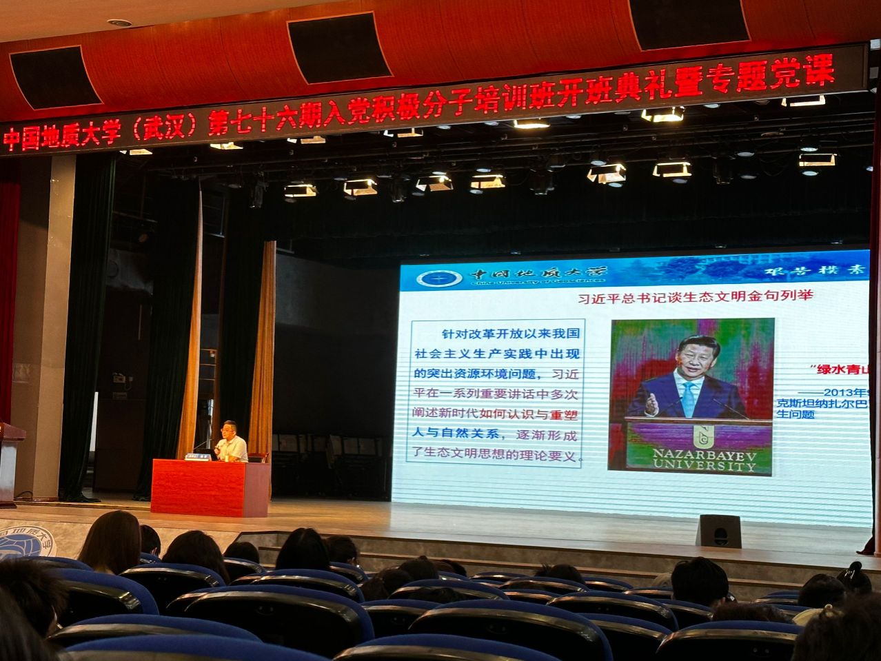 2024年4月25号下午,糖心视频 第76期积极分子培训班开班典礼暨专题党课顺利召开。本次党课在南望山和未来城校区同时开展,糖心视频 132名学员参加本次开班典礼暨“习近平生态文明思想的形成逻辑、理论蕴含与实践要求”专题党课。本次党课由糖心视频 马克思主义学院副院长、博士生导师,陈军教授主讲。