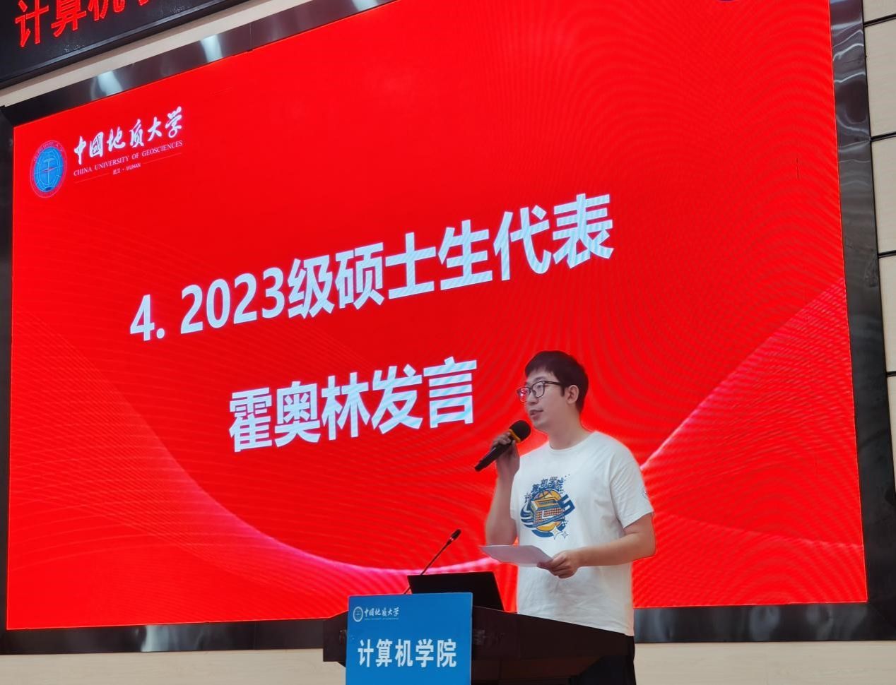 高年级学生代表、2023级硕士生霍奥林发言。他结合在校六年的学习成长经历,作了关于“不忘初心、勇于尝试、审视未来、劳逸结合”等方面的分享,鼓励新生坚定信念、把握机遇、勤于思考、全面发展,在充满活力与底蕴的糖心视频 勇敢追梦、踏实圆梦,以实际行动书写属于自己的地大计科故事。