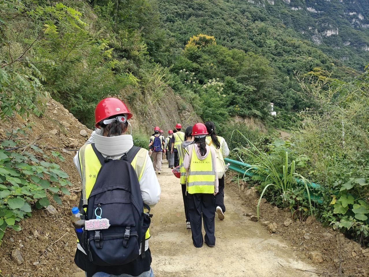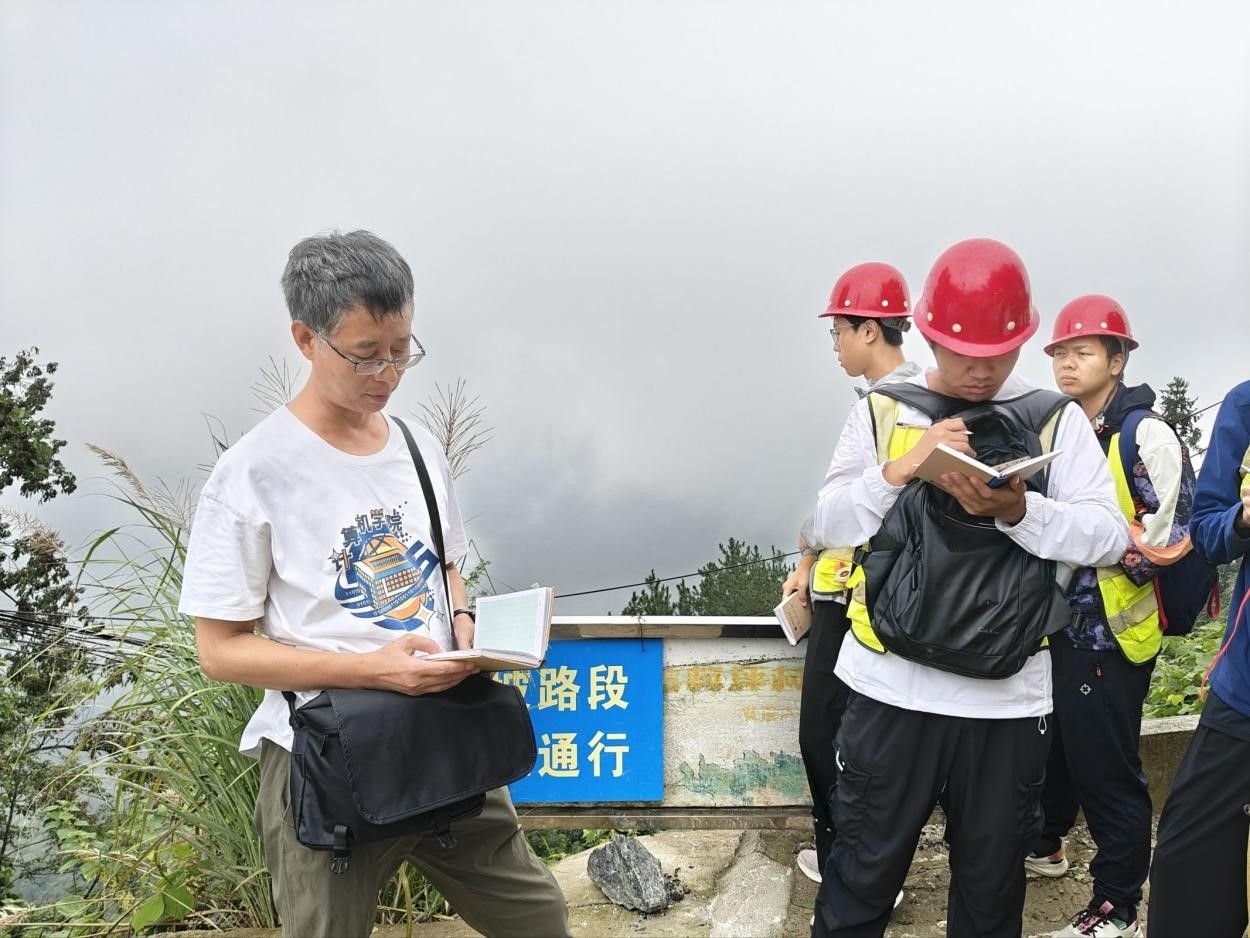 9月13日,天空下起了淅淅沥沥的小雨。大家带上雨伞,背上地质包,按时出发前往填图区南踏勘路线 —— 这是对我们 “地质人” 意志的考验。雨中的山路格外湿滑,每走一步都需要格外小心。何珍文老师带领着我们观察填图区出露的地层界线,教导我们使用地形图定点,并完成野外地质数据采集。