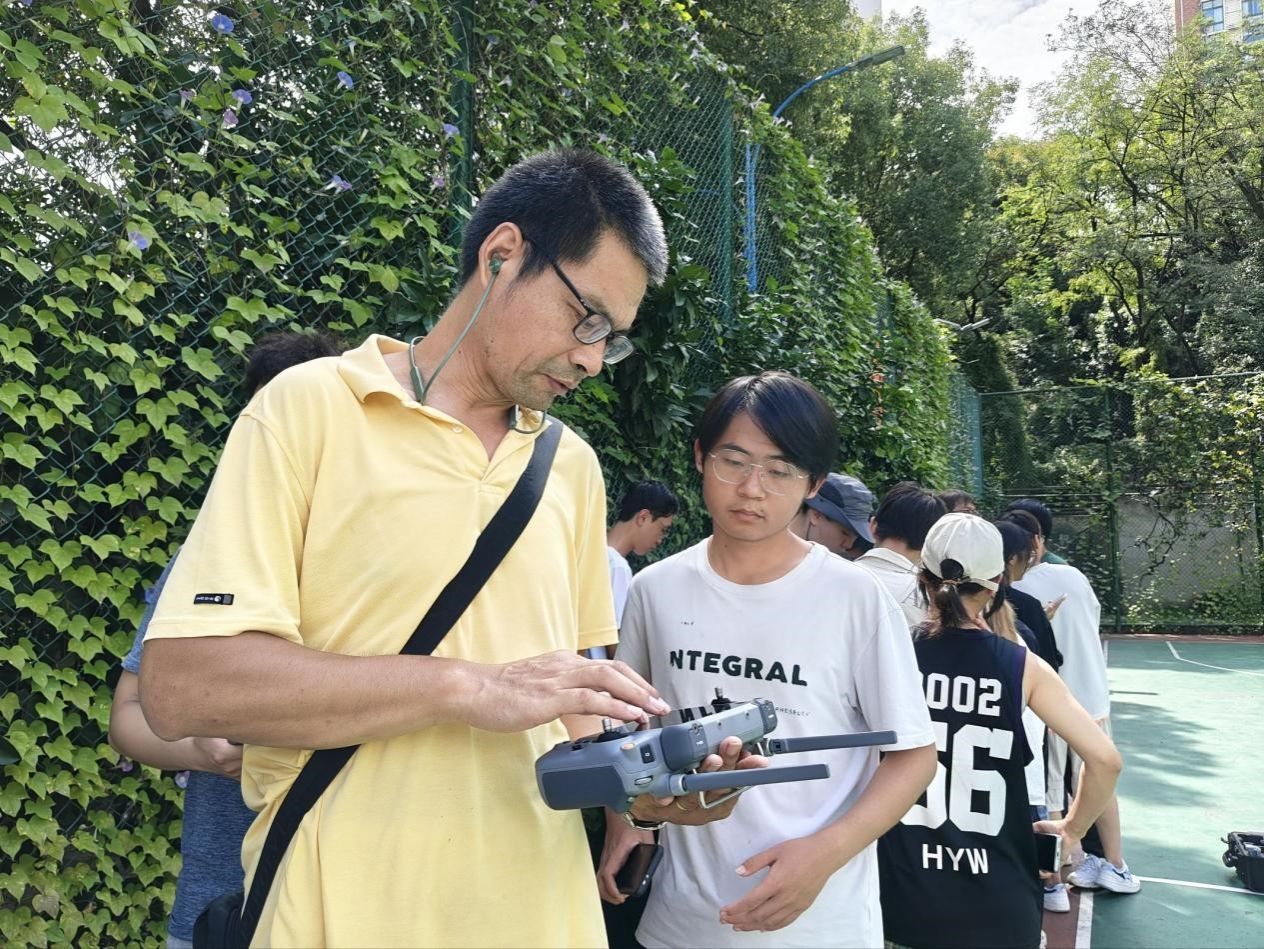 9 月 9 日是无人机飞行教学日,对于空间信息与数字技术专业的我们而言,这是将“地面观测”与“空中视角”结合的重要一课。早在教学前一日,各小组便选派了两名同学提前跟随老师“取经”。从无人机的部件拆解与组装,到遥控器的按键功能、起飞前的设备检查,再到基础飞行姿态的操控技巧,他们仔细记录每一个要点,反复练习悬停、升降等基础动作,直到能熟练应对简单的飞行场景——这份提前 “备课” 的认真,为次日的小组教学打下了坚实基础。