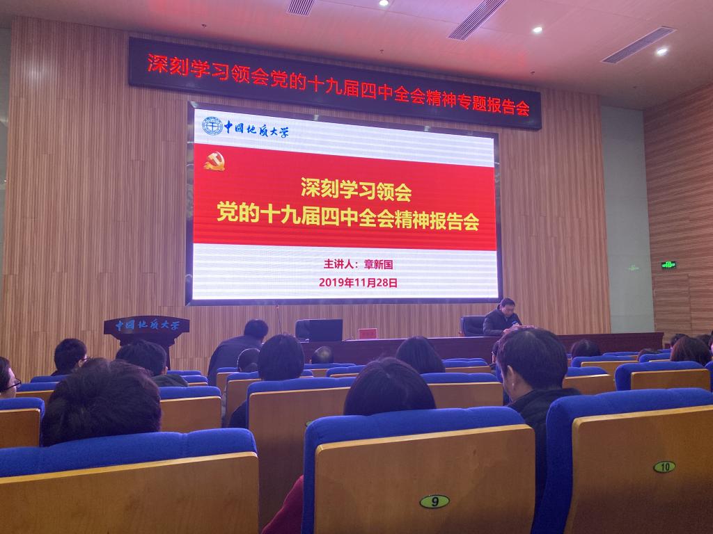 11月28日下午3点,信安支部全体党员同志在未来城校区科教楼一楼报告厅进行了“深入学习领会党的十九届四中全会精神专题报告会”的主题学习。本次报告会由校党委副书记、纪委书记成金华支持,由湖北省委宣传团成员、湖北省委政策研究室副主任章新国同志进行了宣讲报告。