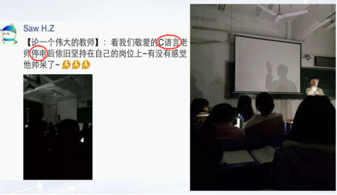 做让学生喜欢的老师,上让学生喜欢的课,这可能是每一个老师追求的梦想。“亲其师”之后,“信其道”和“乐其学”通常会接踵而来。“C语言就是我最喜欢的课程”,工程学院21级新生郭云青说。很快马老师发现,朋友圈里有很多帖子,它们都有一个共同的关键词:抢座位,有越来越多的同学开始不再惧怕“C语言”,反而提前两三个小时来教室占座了。“明晚想看湖南卫视跨年演唱会,还想看学校的晚会,想玩游园嘉年华,然而我也不忍心翘‘C语言’,真是难过”2015年12月31日跨年夜的晚上,有学生发出了这样的感慨。那晚正好有两节《C语言》课,马老师原以为那晚可能会有很多同学请假甚至旷课,没想到大家全都坐在了教室里,那年我校校报和官微在新年的第一天同时刊登专题报道: 跨年夜地大老师用C语言献祝福。2016年的某一天晚上,北综突然停电,教室里一片漆黑。马老师说:“哗然过后,正当我不知所措的时候,同学们竟齐刷刷地举起了手中的手机,打开电筒,照亮了教室,也照亮了我的心,那节课我们就在这道别样的光芒中坚持上完了,这道光芒,属于教室中的每一个人,令我终生难忘。那些所谓的流量明星面对荧光棒时的感觉不过如此吧,当老师,其实很幸福,值得了。”