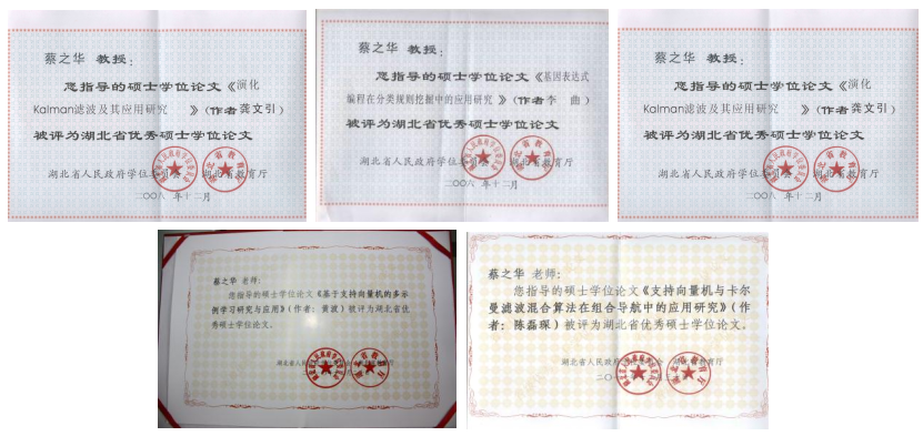 在研究生心目中,蔡之华老师是最好的导师。他们这样评价:“蔡老师不仅用深厚的学识指导学业,还用真挚的情感温暖人心,不仅是学业上的老师,也是生活中的朋友。”蔡老师两次获评学校研究生“良师益友”。蔡老师重视毕业设计过程指导,精益求精,严把论文质量关。在他的指导下,有4名同学获得湖北省优秀硕士论文,1名博士生获湖北省优秀博士论文,8人次获得研究生国家奖学金。到目前为止,蔡之华老师共培养博士和硕士研究生超过百人。指导的学生既有在国内985、211高校破格晋升为教授、在阿里巴巴等知名企业任高级科学家者,也有在国外著名高校任教、Twitter及IBM等公司任高级专家者。