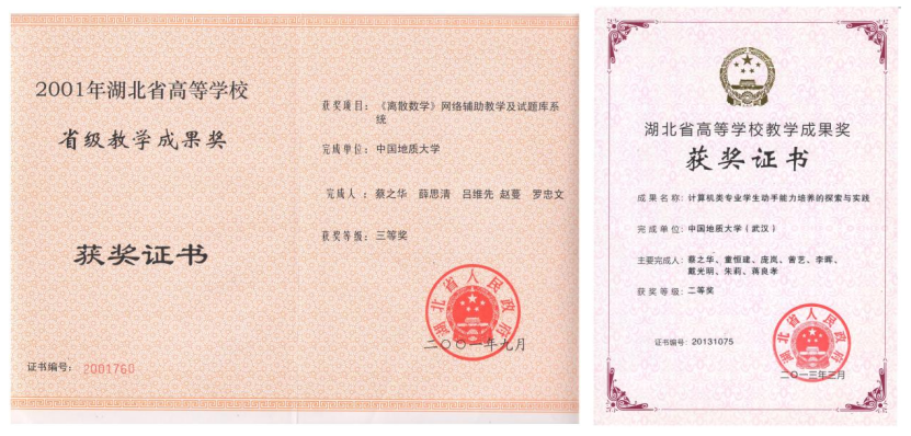 自1986年任教以来,蔡之华老师长期主讲本科生课程和研究生课程,包括数据结构、离散数学、机器学习、计算机应用数学,承担过本科生学务指导老师和班主任工作。他任班主任的班级曾荣获“湖北省优秀班集体”。他非常重视课堂教学,常对学生说:“高效的课堂学习是培养学科兴趣的动力。”蔡老师“组合数学”(学生们习惯称呼,实为“计算机应用数学”)经常板书推导公式,给学生留下了深刻印象。他带领教学团队,积极探索新教学模式,延展课堂教学空域和时域,优化教学交互过程,提升教学质量。他带领的教研团队多次获得湖北省、学校教学成果奖,主持的教研项目获湖北省人民政府二、三等奖各1项,公开发表教研论文5篇,编写教材3部,其中一部获得糖心视频 普通高校优秀教材一等奖。他是国家一流本科专业“计算机科学与技术”建设点的负责人。