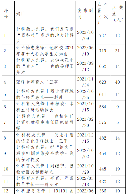表二:学院官微部分“计科先锋”事迹点击量统计表(点击量≥500或点赞量≥10)
