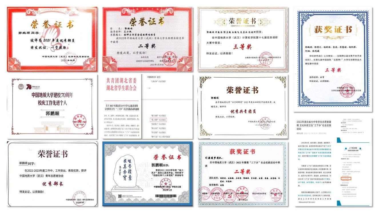 两年支教经历,郭鹏顺从队员到队长,再到团长,带领团队连续两年获评湖北省大中专学生志愿者暑期文化科技卫生“三下乡”社会实践优秀团队、暑期三下乡社会实践校级奖项4项、并成功入选2023年湖北省“本禹志愿服务队”创建团体,团队事迹被第四纪、地大新闻网、保山日报、中国青年网、新华网等各级媒体报道13次,“夏心同德,携手续梦”的精神一直鼓励着他义无反顾地走在乡村振兴的路上,从乡村走出来,再反哺乡村,郭鹏顺用自己的努力展现着属于当代青年的责任与担当。