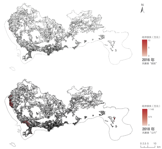 图1 2016年“妮妲”、2018年“山竹”基于经济损失评估模型评估深圳直接经济损失图